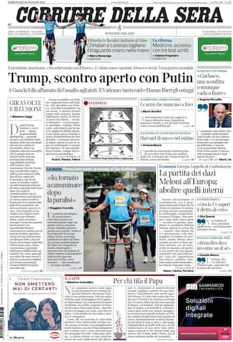 - "Trump, scontro aperto con Putin" è l'apertura di oggi del Corriere sulla guerra in Ucraina. Il presidente Usa si rivolge al leader russo: "Sta scherzando col fuoco", mentre "Mosca evoca la Terza guerra mondiale". Intanto a Gaza "la folla affamata dà l'assalto agli aiuti". Spazio anche alla questione dazi: "Meloni all'Europa: abolire quelli interni". Poi, l'intervista al ministro Nordio sul caso Garlasco: "Una sconfitta comunque vada a finire". Infine, la storia di un paziente paraplegico "tornato a camminare dopo la paralisi"