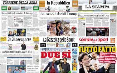 È il caos provocato dallo scontro sui dazi Usa a dominare quasi tutte le aperture dei giornali in edicola. Mercati in fibrillazione dopo il blocco dei giudici federali e lo stop della Corte d'Appello in seguito al ricorso di Trump, che tuona: "Avanti lo stesso". Grande spazio per gli spiragli di tregua a Gaza: sì di Israele al piano Usa per il cessate il fuoco, ma arriva la frenata da parte di Hamas. Sugli sportivi in primo piano il valzer delle panchine, col ritorno di Allegri al Milan e Conte che resta a Napoli
