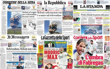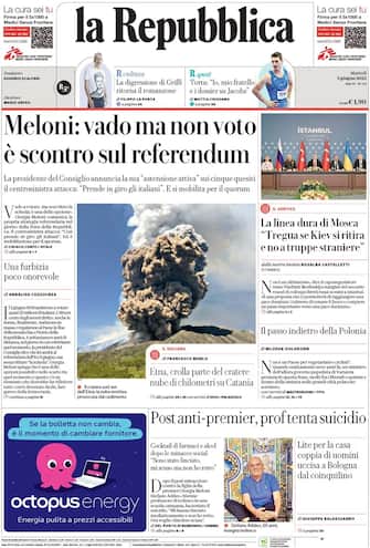 - Le parole di Meloni trovano spazio anche sulla prima di Repubblica, con la premier che annuncia la sua "astensione attiva" e il centrosinistra che attacca. Fotonotizia dedicata anche in questo caso alla coltre di fumo provocata dall'Etna, mentre di spalla spazio alla guerra in Ucraina, con la linea dura di Mosca: "Tregua se Kiev si ritira e no a truppe straniere"