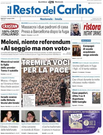 - Anche il Resto del Carlino si allinea, puntando sulle parole della premier in apetura: "Al seggio ma non voto". Taglio alto per il duplice omicidio di ieri a Bologna: il coinquilino arrestato a Barcellona