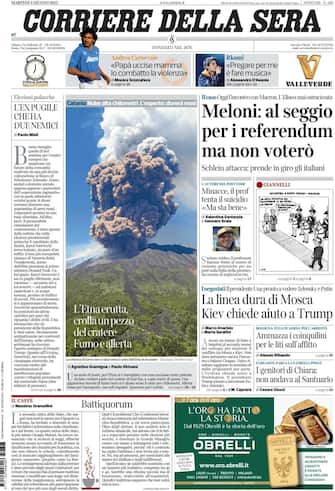 - Referendum, Ucraina ed Etna: tanti i temi in apertura sui quotidiani in edicola oggi. Il Corriere della Sera si concentra sulle polemiche scaturite dalla dichiarazione della premier Meloni, che si recherà alle urne domenica per il referendum, ma non voterà. Schlein attacca: "Prende in giro gli italiani". A fianco, la paura per l'eruzione dell'Etna: crolla un pezzo del cratere, fumo e allerta