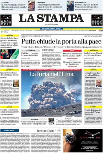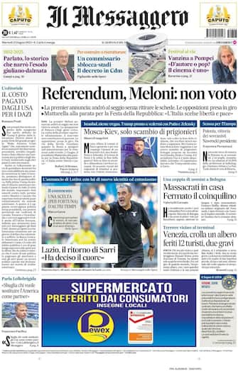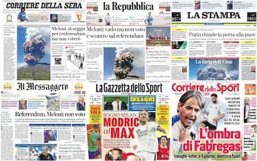 Le parole della premier Giorgia Meloni, che ha annunciato l'intenzione di non votare, al referendum dell'8-9 giugno, in apertura sulla maggior parte dei giornali in edicola. Polemiche dal centrosinistra, che attacca: "Prende in giro gli italiani". In evidenza anche l'eruzione dell'Etna, col crollo di un pezzo del cratere, e il fallimento dei negoziati sull'Ucraina a Istanbul. Sugli sportivi, giornata decisiva per il futuro di Simone Inzaghi: oggi si saprà se sarà ancora lui l'allenatore dell'Inter