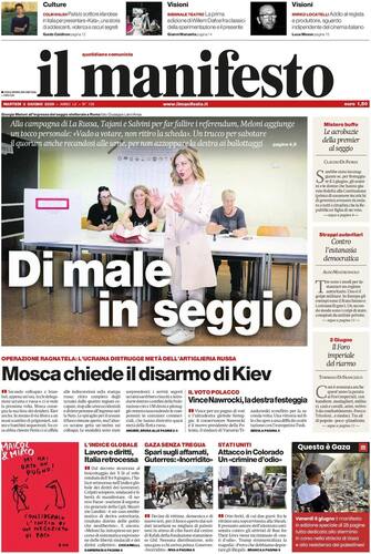 - 'Di male in seggio' è il gioco di parole scelto dal Manifesto per criticare la scelta annunciata dalla presidente del Consiglio, accusata di voler sabotare il quorum. Sotto, spazio al'Ucraina, con Mosca che chiede il disarmo di Kiev