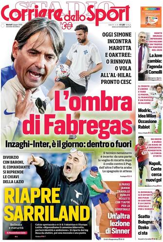 - Sul Corriere dello Sport spazio all'incontro decisivo per il futuro dell'Inter: appuntamento oggi tra la società e Simone inzaghi per decidere se proseguire insieme, col tecnico sempre più tentato dall'Arabia. In caso di addio per la panchina nerazzurra c'è in pole il nome di Fabregas. Ufficiale il ritorno di Sarri alla Lazio