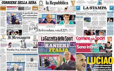 C'è la bassa affluenza nel primo giorno di referendum in apertura dei principali giornali in edicola: Meloni al seggio non ritira le schede. A farla da padrone è anche lo sport, col clamoroso annuncio dell'esonero di Luciano Spalletti alla vigilia del match tra Italia e Moldova. Il selezionatore azzurro sarà comunque in panchina: Ranieri favorito per sostituirlo. Grande spazio anche alla sconfitta di Sinner al termine di una epica maratona in finale al Roland Garros contro Alcaraz