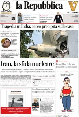 - "Tragedia in India, aereo precipita sulle case". Lo schianto al decollo, il volo era diretto a Londra: un solo superstite tra le 242 persone a bordo, "decine di vittime anche a terra". Spazio poi alla "sfida nucleare" dell'Iran e allo scontro con l'Aiea. Intanto, secondo i media Usa, Israele sta per colpire l'Iran. Puglia, "carabiniere ucciso dai ladri ad un passo dalla pensione"