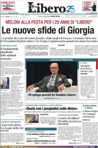 - "Le nuove sfide di Giorgia". Meloni alla festa per i 25 anni di "Libero": "Italia meglio di Francia e Gemania. Giù le tasse". E Vittoria Feltri racconta perchè ha fondato il giornale. Carabiniere ucciso in Puglia, intervista a Piantedosi: "Basta con i pregiudizi sulle divise". Politica: "Al governo arriva Sbarra, ex leader della Cisl"