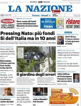 - "Pressing Nato: più fondi. Sì dell'Italia ma in 10 anni". Spese militari, summit tra Meloni, Tajani e Rutte. L'Alleanza atlantica: "Serve il 5% del Pil". Caso Denise, uccisa a Prato: nella casa del killer "il giardino degli orrori". Puglia: "Carabiniere ucciso dai ladri". Tragedia in India, aereo precipita al decollo: oltre 300 vittime ed un solo superstite