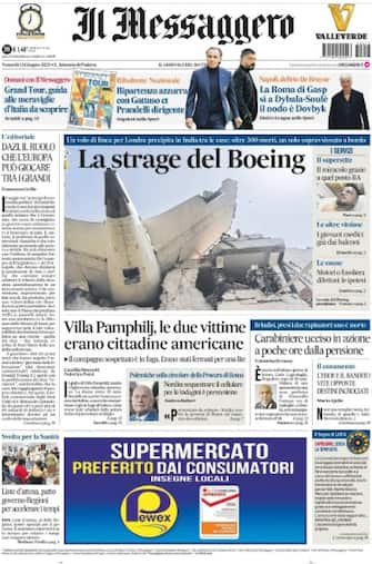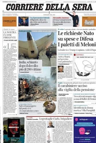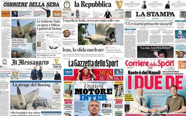 Sulle prime pagine dei quotidiani, oggi in edicola, spazio alla tragedia aerea in India, con un Boeing diretto a Londra precipitato poco dopo il decollo che ha causato centinaia di vittime. Poi ancora all'incontro tra Meloni e Rutte, alla morte di un carabiniere in Puglia e agli ultimi risvolti legati al ritrovamento di due cadaveri a Villa Pamphilj, a Roma. Per lo sport, ecco gli sviluppi di calciomercato con l'acquisto del Napoli di De Bruyne su tutti