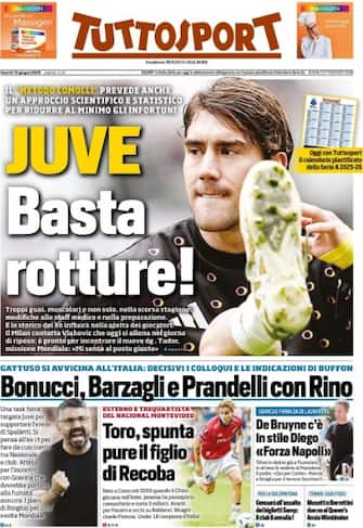 - "Juve, basta rotture!". Il "metodo Comolli" prevede anche un approccio scientifico e statistico "per ridurre al minimo gli infortuni". Il Milan "contatta Vlahovic", il Napoli accoglie De Bruyne "in stile Diego", mentre per il Torino spunta l'idea legata al figlio di Recoba. Nazionale: "Bonucci, Barzagli e Prandelli con Gattuso". Decisivi "i colloqui e le indicazioni di Buffon"