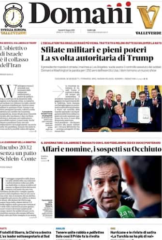 - "Sfilate militari e pieni poteri. La svolta autoritaria di Trump". Il presidente Usa manda in strada i marines a Los Angeles: "vuole avere il controllo assoluto dei soldati". Medioriente: "L'escalation tra Israele ed Iran è più vicina". Intanto c'è stata una trattativa Meloni-Rutte "sui soldati per la Nato". Affari e nomine: "I sospetti su Occhiuto". Il governatore calabrese è indagato con il suo "fedelissimo" Posteraro