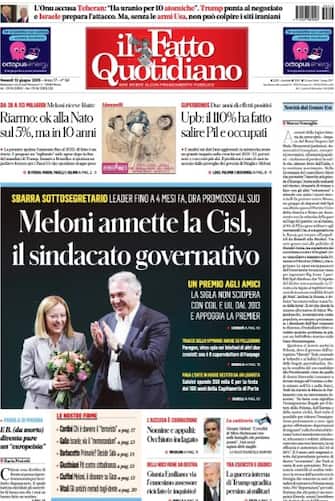 - Politica e lavoro: "Meloni annette la Cisl, il sindacato governativo". La sigla "non sciopera con Cgil e Uil dal 2013 e appoggia la premier". Riarmo, Meloni riceve Rutte a Roma: "Ok alla Nato sul 5% ma in 10 anni". Superbonus: "Upb, il 110% ha fatto salire Pil e occupati". Usa: "La guerra interna di Trump sgradita persino ai militari"