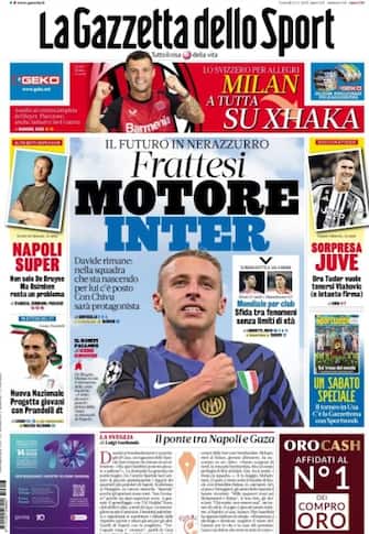 - Tanto calciomercato in prima pagina. Il Milan "a tutta su Xhaka", l'Inter vuole affidare un ruolo sempre più centrale a Frattesi mentre, a sorpresa, Tudor "vuole tenersi Vlahovic" alla Juventus. Napoli, intanto, abbraccia De Bruyne e sogna in grande. Capitolo Nazionale: "Progetto giovani con Prandelli dt". Mondiale per club al via: "Sfida tra fenomeni senza limiti d'età"