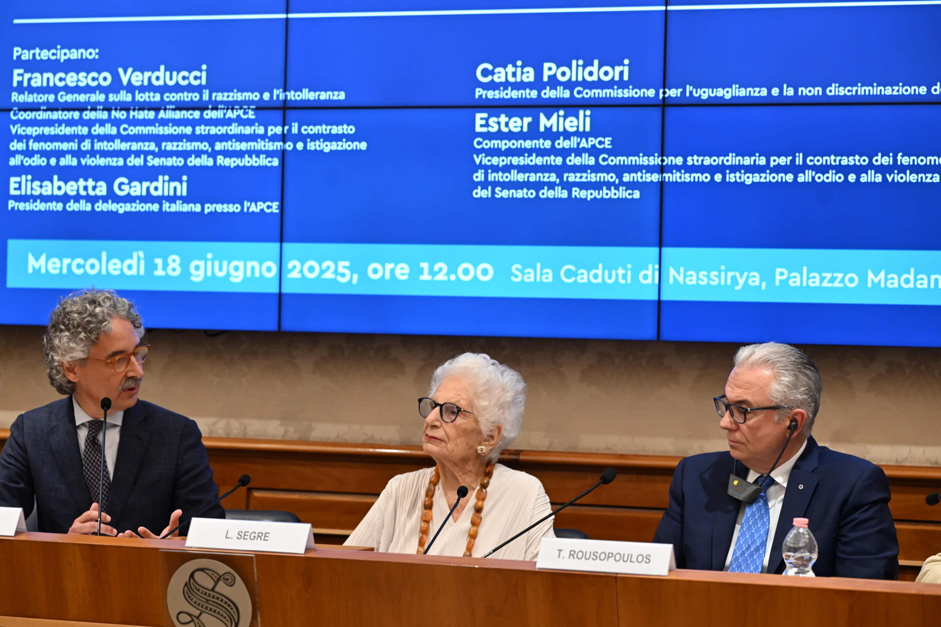 "E' particolare trovarmi nella Giornata di contrasto al discorso d'odio e non riuscire a prescindere dal ricordare l'esperienza di odio, una esperienza diretta, che non ti abbandona, che ti ha segnato tutta la vita, che non basta amore, maternità, diventare nonna e bisnonna per dimenticare quel numero scritto sul mio braccio - vergogna per chi l'ha fatto - e tutto l'odio che è derivato da quello". Ha esordito così la Senatrice Liliana Segre il proprio intervento alla conferenza stampa tenuta in Senato assieme al Presidente dell'Assemblea parlamentare del Consiglio d'Europa (APCE), Theodoros Rousopoulos, prima della audizione di questi alla Commissione per il contrasto al discorso d'odio presieduta dalla stessa Segre.