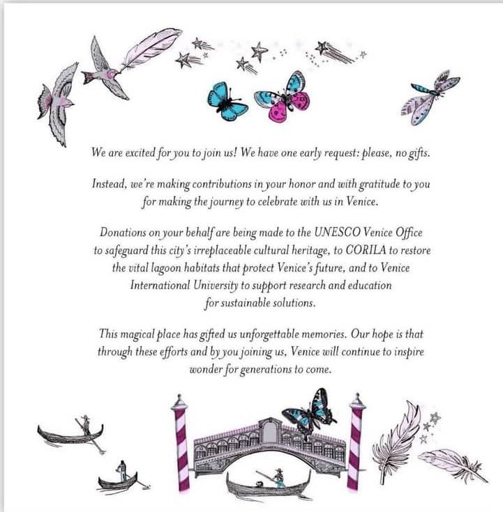 Il messaggio di partecipazione, invece, invita i partecipanti a non fare regali – “l'unica opzione, in realtà, per uno degli individui più ricchi del mondo”, fa notare Cnn – e promette di fare donazioni per loro conto all’ufficio Unesco di Venezia, al programma di ricerca Corila sulla biodiversità della laguna e all’Università Internazionale. Buone intenzioni che però non hanno calmato gli animi di quanti, in questi giorni, hanno protestato contro l’arrivo del multimiliardario e del suo seguito di vip nella laguna.