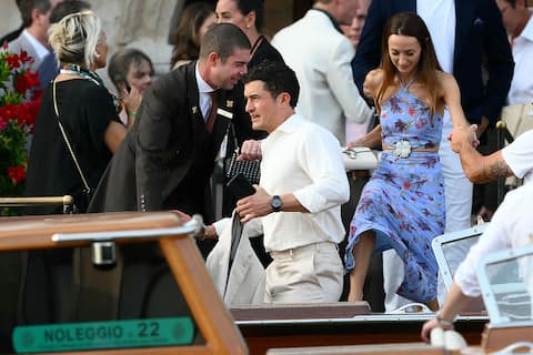 - L’attore Orlando Bloom è arrivato a Venezia senza la compagna Katy Perry, con la quale pare ci sia “grossa crisi”. Indossa un look molto candido, pantaloni panna e camicia bianca