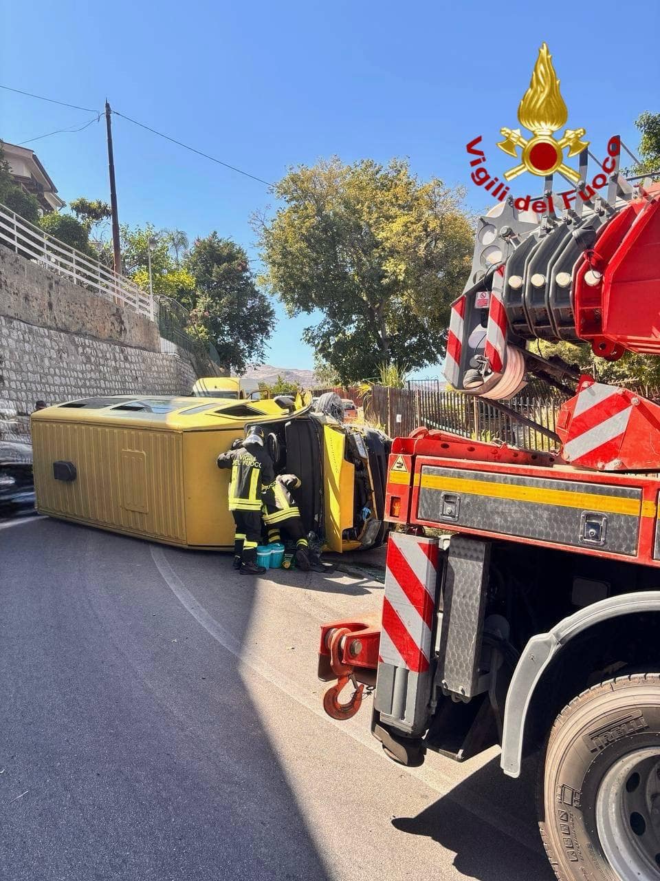 Il personale VVF è impegnato per la rimessa in strada del mezzo tramite autogrù dei pompieri. Nelle foto scattate dai Vigili del fuoco il pulmino, di colore giallo e con la scritta "scuolabus" sul cofano, appare ribaltato sul fianco destro. Via Ruffo di Calabria collega Palermo con San Martino delle Scale, frazione di Monreale.