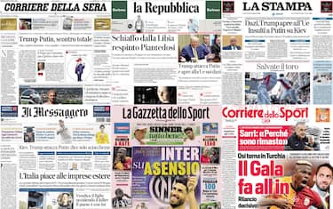 Sulle prime pagine dei principali quotidiani italiani troviamo lo scontro tra il presidente statunitense Donald Trump e quello russo Vladimir Putin, con il tycoon che lo accusa di "dire un sacco di sciocchezze". Spazio anche alla questione dazi con l'apertura di Trump all'Unione Europea. Respinto in Libia il ministro dell'Interno Matteo Piantedosi: "Non è gradito, ingresso illegale". Poi, la cronaca con la morte di un uomo all'aeroporto di Orio al Serio, dopo essersi gettato nel motore di un aereo