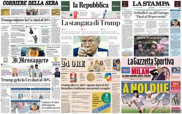 Aperture dei giornali dedicate alla decisione di Trump di imporre dazi del 30% all'Ue a partire dall'1 agosto. Bruxelles: "Pronti a contromisure". Meloni: "Dobbiamo trattare". Rischio stangata da 35 miliardi per il made in Italy. Poi spazio a Gaza (Hamas rifiuta la proposta di tregua del Qatar), al giallo di Ventimiglia (scomparso un bimbo di 5 anni) e al delitto di Garlasco (diffuse online, a pagamento, le immagini dell'autopsia di Poggi). Infine lo sport, con la finale di Wimbledon tra Sinner e Alcaraz