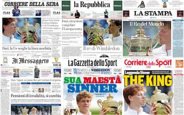 Aperture dei giornali dominate dalla storica impresa di Jannik Sinner a Wimbledon: il tennista italiano travolge Alcaraz in quattro set e diventa il primo italiano a trionfare sull'erba londinese dal 1877. ”È il sogno dei sogni" dice Jannik, immortalato quasi ovunque mentra bacia il trofeo consegnatogli dalla principessa Kate. Spazio anche ai dazi, con la linea morbida scelta per il momento dall'Ue: contromisure congelate. A Gaza ennesima strage di innocenti in fila per l'acqua