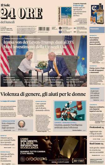 - Apertura su “Intesa von der Leyen-Trump: dazi al 15%”, con le reazioni “Meloni: bene l'accordo, aiuti ai settori colpiti”, "Merz: con il patto evitata l'escalation" e l’analisi “Più certezza ma vince la forza”. In primo piano anche “Violenza di genere, gli aiuti per le donne”, con una mappa del sostegno. Si parla di giustizia e innovazione con l’inchiesta tecnologia e futuro “Quando l’intelligenza artificiale aiuta l’efficienza”