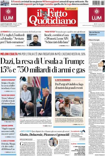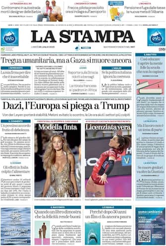 - Titolo principale sull’intesa commerciale: “Dazi, la resa di Ursula a Trump: 15% e 750 miliardi di armi e gas”. “Meloni esulta ma per l’Italia c’è una fregatura in più: l’acciaio resta al 50%”. Netanyahu apre un corridoio umanitario a Gaza, ma si contano 38 morti: “Israele, corridoi a Gaza e 38 morti. Leone XIV: "Schiacciati dalla fame". L’Ue taglia 1,5 miliardi destinati a Kiev: “Avvisato per l’anti-corruzione”. Focus anche sul turismo: “Da Parigi al Giubileo, fuga dai grandi eventi”
