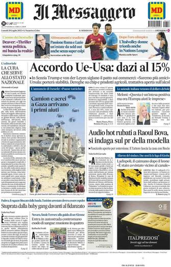 - Titolo principale: “Pax scozzese, dazi al 15%”, “anche per auto e farmaceutica ma per acciaio e alluminio rimane al 50%” e maxi investimenti in Usa. Israele riapre l’accesso per aiuti a Gaza: “Tornano gli aiuti. Israele lancia viveri su Gaza”. In taglio basso, l’incidente mortale in A4 “Contromano, quattro morti” e “Il ricatto degli audio rubati a Raoul Bova. Indagato l'amico della modella”