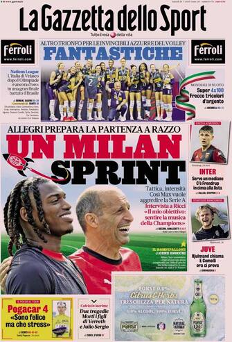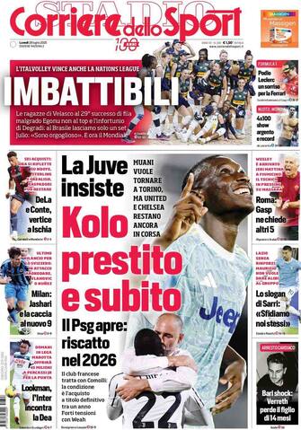 - Prima pagina per l’Italvolley che vince anche la Nations League: “Imbattibili”, 29 vittorie di fila e ora si guarda al Mondiale. Mercato Juve: “Kolo prestito e subito”, il Psg apre al riscatto nel 2026. Spazio anche a Leclerc sul podio in F1 “Podio Leclerc un sorriso per la Ferrari” e allo “show argento” dei 4x100 ai Mondiali di nuoto