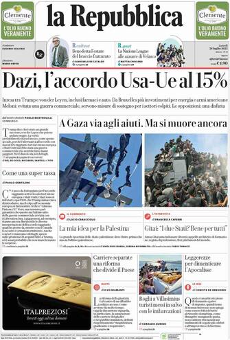 - Titolo principale sull’intesa commerciale Usa-Ue: “Dazi, l’accordo Usa-Ue al 15%”, con focus sulle reazioni europee. In primo piano anche la guerra in Medio Oriente e la tregua umanitaria a Gaza: “A Gaza via agli aiuti. Ma si muore ancora”, con l'intervista a Gitai: “Due Stati? Bene per tutti”. In taglio basso le carriere separate nella giustizia: “Una riforma che divide”