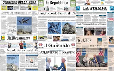 - Apertura sull’intesa commerciale fra Stati Uniti e Unione europea raggiunga in Scozia: “Accordo Usa-Europa: dazi al 15%". Meloni: “Bene ma voglio vedere i dettagli”. In evidenza anche la giornata di tregua umanitaria a Gaza per l'arrivo di aiuti dal cielo e da terra, ma la strage non si ferma: “Gaza, gli aiuti contro la fame: non basterà”. In spala anche la guerra in Ucraina: “A Sumy linea d'ombra della resistenza ucraina”. In taglio basso, lo scontro mortale in A4: “Va contromano in autostrada, 4 morti”