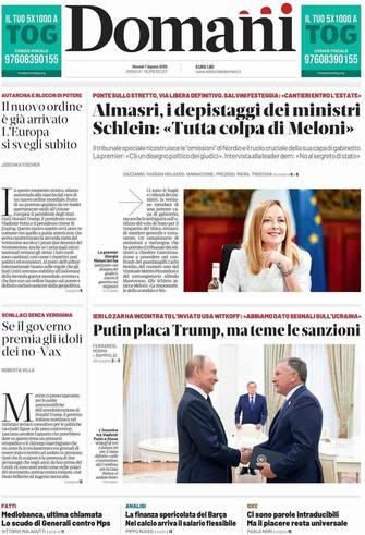 - In apertura: “Almasri, i depistaggi dei ministri. Schlein: ‘Tutta colpa di Meloni’”, dedicato al caso giudiziario che coinvolge Nordio, Piantedosi e Mantovano. “La premier: 'C’e un disegno politico dei giudici'". In evidenza anche il via libera definitivo al Ponte sullo Stretto. A centro pagina, spazio all’incontro tra Putin e l’inviato di Trump, con il titolo “Putin placa Trump, ma teme le sanzioni”. Tra i commenti, un editoriale di Fischer sull’Europa che deve “svegliarsi subito”