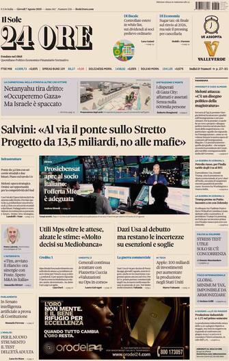 - Titolo d’apertura sull’infrastruttura che divide la politica: “Salvini: ‘Al via il ponte sullo Stretto. Progetto da 13,5 miliardi, no alle mafie’”. Focus anche sulla tensione crescente tra Israele e Gaza: “Netanyahu tira dritto: ‘Occuperemo Gaza’. Ma Israele è spaccato”. In campo economico, l’allarme sulle tariffe americane: “Dazi Usa al debutto, ma restano le incertezze su esenzioni e soglie”. Spazio anche allo scontro politica-magistratura: “Meloni attacca: ‘C’è un disegno politico della magistratura’”