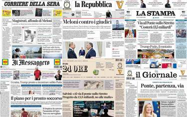 - Titolo principale: “Meloni contro i giudici”, con accuse di disegno politico della magistratura sul caso Almasri. Focus sulla guerra in Ucraina: “Trump: presto l’incontro con Putin e Zelensky”. In spalla: “Ponte sullo Stretto c'è il via”, con le critiche dell’opposizione: “Il Pd a Salvini: spreco colossale”. In taglio basso: “Stop ai vaccini, l’ultima follia di Kennedy jr”. Cronaca nera: “Senza sorveglianza si suicida in cella l’assassino di Sara” Campanella