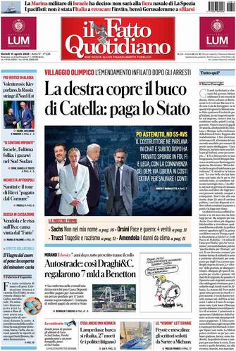 - L’apertura è su “La destra copre il buco di Catella: paga lo Stato”, con l’emendamento approvato dopo gli arresti. Ampio spazio all’inchiesta “Autostrade: così Draghi&C. regalarono 7 mld a Benetton”. In evidenza anche la tragedia di Lampedusa, “Barca ribaltata, 27 morti (e i politici litigano)”, e la guerra in Ucraina “Volenterosi e Kiev parlano, la Russia stringe il Nord-Est”. Spazio anche al Medio Oriente: “L’ultima follia, i gazawi nel Sud Sudan”