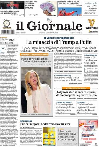 - Il titolo principale è su “Usa e Ue, avviso a Putin”, con la linea condivisa con Zelensky per il vertice in Alaska e l’avvertimento di Trump: “Mosca si fermi o gravi conseguenze”. In evidenza il Medio Oriente: “L’Idf approva il piano per invadere Gaza”. Ampio spazio alla “Strage dei migranti in rotta per Lampedusa” con l’immagine del salvataggio. In spalla, le parole di un giovane a bordo dell’auto che ha ucciso Cecilia De Astis: “Siamo scappati per paura”, mentre in basso troviamo il racconto di Moro: “Le scalate di Confortola sono inventate”