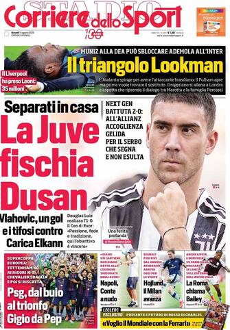 - L’apertura è su “La Juve fischia Dusan”, con Vlahovic che segna ma non esulta, accolto da contestazioni. In primo piano il mercato con “Il triangolo Lookman”, affare tra Atalanta, Inter e Fulham, e la notizia “Il Liverpool ha preso Leoni: 35 milioni”. In evidenza la Supercoppa europea: “Psg, dal buio al trionfo. Gigio da Pep”. In taglio basso, il futuro di Hojlund: “Il Milan avanza”, e le mosse di Roma e Napoli con Bailey e Conte
