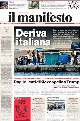 - L’apertura è su “Deriva italiana”, con la foto dei soccorritori a Lampedusa e il racconto della nuova strage di migranti, “Ventisette cadaveri recuperati, quasi altrettanti dispersi”. In primo piano la politica internazionale con “Dagli alleati di Kiev appello a Trump: ‘Nessuna decisione senza l’Ucraina’”. In taglio laterale, il focus su Gaza: “Espulsione via, l’esercito presenta i piani di conquista” e l’editoriale “Meglio morti” sul dramma dei migranti. In prima anche “Armi, il business è inarrestabile”