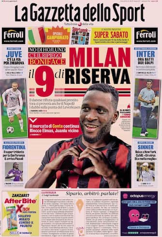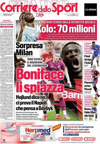 - Apertura con “Boniface li spiazza”. Il Milan sorprende tutti puntando sull’attaccante del Leverkusen, mentre Hojlund dice no e il Napoli prova a inserirsi. In alto: il PSG non scende dalla valutazione di 70 milioni per Kolo Muani. Spazio anche all’Inter, interessata a Cissé, e alla Fiorentina che prende Piccoli. In spalla il mercato: “Roma, Fabio Silva alla Gasp”