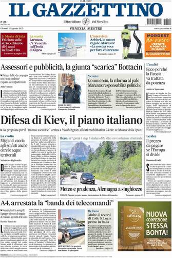 - Il giornale apre con “Difesa di Kiev, il piano italiano”, con la proposta di un “mutuo soccorso” che mobilita gli alleati in 24 ore se Mosca viola i patti, con l’analisi “Ecco perché la Russia va trattata da potenza”. In primo piano anche la cronaca veneta: “Assessori e pubblicità, la giunta ‘scarica’ Bottacin”. Spazio poi al tema migranti: “Caccia agli scafisti anche oltre le acque territoriali”. Tra gli altri titoli “A4, arrestata la banda dei telecomandi” e “Belluno, multe record: Colle S. Lucia primo in Italia”
