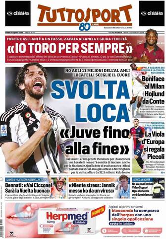 - Titolo principale: “Svolta Loca. Juve fino alla fine”. Locatelli rifiuta 11 milioni dall’Al Ahli e resta bianconero: “non se l'è sentita di lasciare: anche per la Nazionale”. In apertura anche Zapata che rilancia: “Io Toro per sempre”. Grande spazio al mercato Milan con Boniface e Hojlund da Conte. La Fiorentina si regala Piccoli per la Conference. In taglio basso ciclismo: “Bennati:’Vai Ciccone! Sarà la Vuelta buona’”
