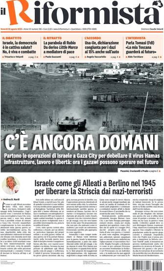 - "C'è ancora domani". Partono le operazioni di Israele a Gaza City "per debellare il virus Hamas. Infrastrutture, lavoro e libertà: ora i gazawi possono sperare nel futuro". Il commento sul conflitto: "Israele come gli Alleati a Berlino nel 1945 per liberare la Strisica dai neo-nazisti". Usa-Ue: "Dichiarazione congiunta per i dazi al 15% anche sulle auto"