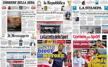 Diversi i temi sulle prime pagine dei quotidiani, in edicola oggi. Spazio per gli sviluppi nella guerra in Medioriente, con l'avanzata dei tank israeliani su Gaza City e su quelli legati all'Ucraina con Trump che chiede altro tempo per arrivare alla pace tra Mosca e Kiev. Focus poi sui dazi Usa-Ue, sullo sgombero a Milano del Leoncavallo, sullo stop di Mediobanca all'offerta su Banca Generali e sulla morte dell'alpinista italiano Luca Sinigaglia in alta quota