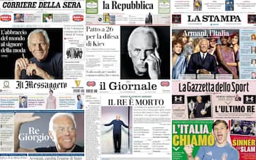 La morte di Giorgio Armani monopolizza le prime pagine dei quotidiani, in edicola oggi. "Re Giorgio", icona della moda e del made in Italy, è scomparso a 91 anni. Spazio inoltre per il vertice dei Volenterosi a Parigi da cui emerge "un patto" per la difesa di Kiev. Ma Giorgia Meloni conferma il no all'invio delle truppe italiane. Per il calcio, infine, l'esordio di Gattuso come ct dell'Italia impegnata nelle qualificazioni ai Mondiali di calcio