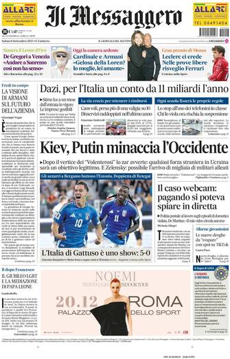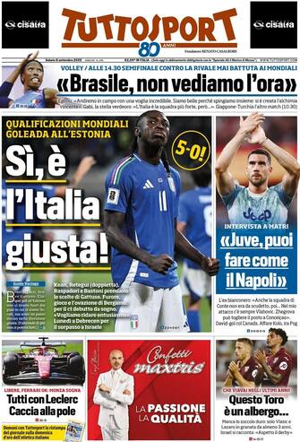 - L'Italia spacca: gli azzurri contro l'Estonia dilagano nella ripresa, finisce 5-0. Le reti (che possono risultare fondamentali per passare il turno) vengono messe a segno da Retegui (che fa doppietta nella sua Bergamo), Kean, Raspadori e Bastoni. La gioia del ct Gattuso: "Ora giochiamo così pure contro Israele". F1, carica Ferrari: a Monza, alle ore 16, si decide la pole position. Leclerc convince, è secondo nelle libere. E Vasseur ha fiducia: "Impresa possibile". Mondiali di volley, l'Italia contro il tabù Brasile per il sogno finale