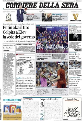 - La guerra in Ucraina in apertura: "Putin alza il tiro, colpita a Kiev la sede del governo". La Ue: "Si fa beffe della diplomazia". Ira degli Usa. A Gaza raid israeliano su una scuola-rifugio: "decine di morti". Armani, camera ardente a Milano: "Diecimila in coda, oggi i funerali nella sua Rivalta". Acutis e Frassati "ora santi, la gioia del Papa". Sport: "Le azzurre del volley sul tetto del mondo". Tennis, Us Open: "Sinner capitola, il re ora è Alcaraz".