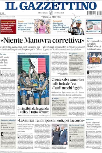 - Giorgetti a Cernobbio: "Niente manovra correttiva, conti in ordine ma valutiamo l'impatto delle spese per la Difesa". Ucraina: "Maxi raid russo su Kiev. Trump minaccia sanzioni a Mosca". Veneto: "La Lega accelera su Stefani". Sport: "Invincibili da leggenda, il volley è tutto azzurro". Us Open: "Sinner non ce la fa, Alcaraz di nuovo re di New York". F1, a Monza "delusione Ferrari".