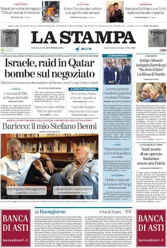 - Ancora in primo piano il raid israeliano sul Qatar, che aveva come obiettivo "il numero uno dei mediatori di Hamas". Doha risponde: "Codardi". Spazio anche all'addio a Stefano Benni, "ribelle della cultura", e il ricordo di Alessandro Baricco. In prima pagina anche la crisi di governo in Francia e la nomina del nuovo premier Lecornu, Gentiloni: "I populisti svuotano l'Europa". Focus anche sul caso Almasri: "Indagata Bartolozzi: 'Ha detto il falso'"