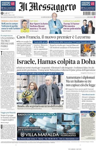 - In prima pagina ancora l'attacco israeliano contro Hamas a Doha. "Eliminati 5 alti dirigenti". Ira dei Paesi arabi: "Gravissimo". Trump "sente Netanyahu e informa il Qatar prima dell'operazione". Spazio anche alla situazione politica in Francia, con la nomina del nuovo premier Lecornu. Ancora il caso Almasri, con la capo di gabinetto della Giustizia che risulta indagata. Il rapporto Ocse sui diplomati, "ma un italiano su tre non capisce ciò che legge". Focus anche sul patrimonio di Pippo Baudo: "Alla segretaria un terzo dell'eredità"
