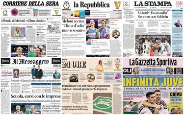 In apertura dei giornali, le parole di Meloni dopo l'attentato a Kirk: "La sinistra minimizza il clima d'odio". Schlein: "Lei fomenta, è irresponsabile". La vedova dell'attivista: "Chi lo ha ucciso non ha idea di cosa ha scatenato". Droni russi, nuovo allarme in Polonia: si alzano in volo i jet Nato. La Romania denuncia: "Hanno violato anche il nostro spazio aereo". Economia, Giorgetti frena sul taglio dell'Irpef: "Il quadro è diventato complicato". Serie A, uno spettacolare Juventus-Inter finisce 4-3