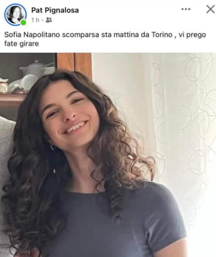 Al momento della scomparsa Sofia indossava pantaloni neri e felpa beige; ha i capelli castani lunghi e ricci. Si sarebbe allontanata in compagnia di un amico. “Se qualcuno la vede o ha informazioni utili, contatti subito le forze dell’Ordine (112) o scriva al +39 347 550 9780” scrive sui social la mamma.